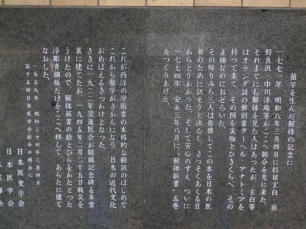杉田玄白らが腑分けを行い,解体新書を訳したことを記念する