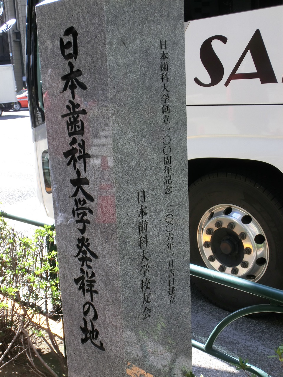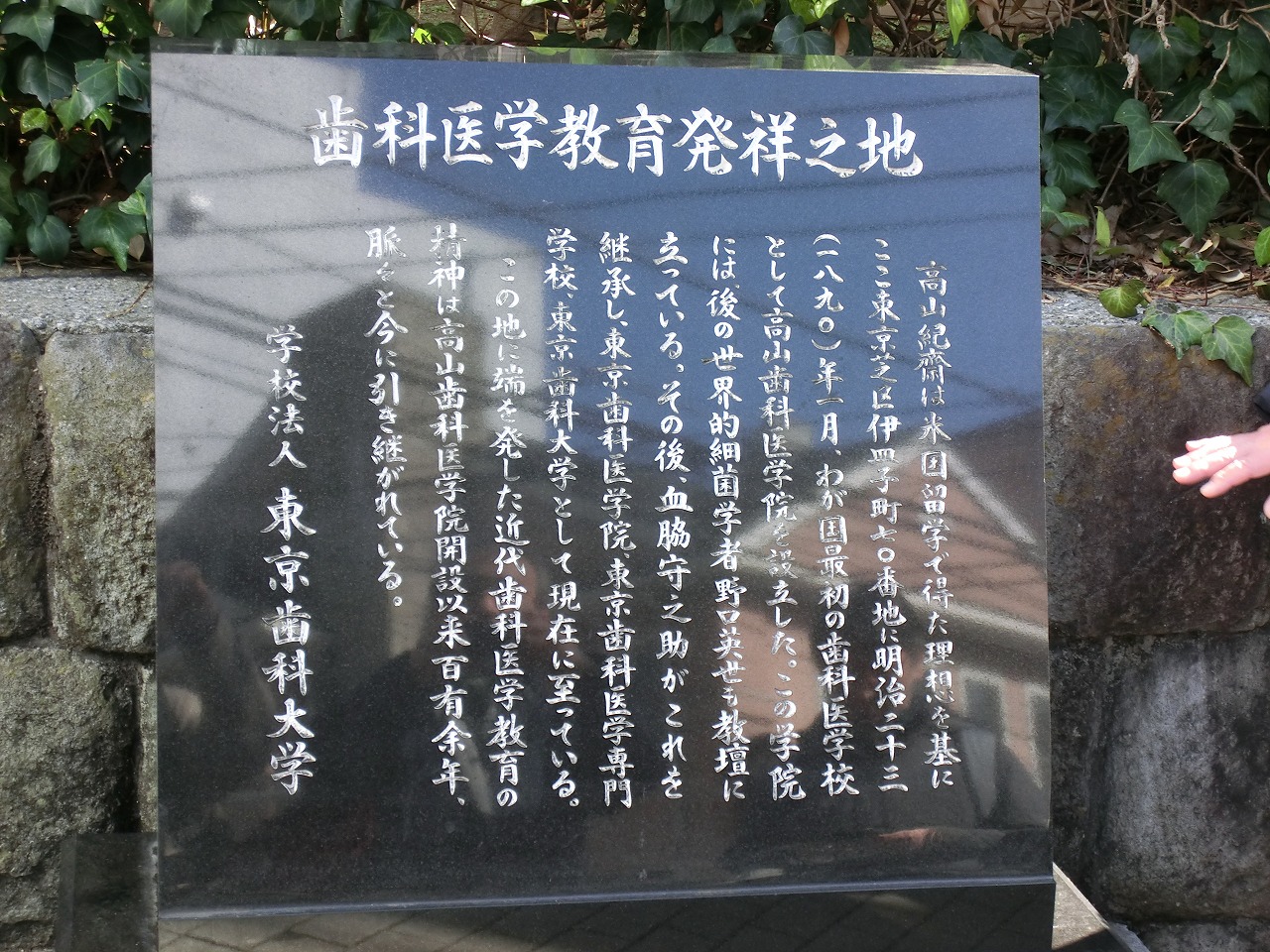 さて,本題に戻って,泉岳寺駅から坂道を登ります。伊皿子坂です。 坂の途中,マンションの一角に東京歯科大学発祥の地碑があります。 1998(平成10)年建立です。 1890(明治23)年に高山紀齋が,この地に高山歯科医学院を創立した。 その後1899(明治32)年に学院を血脇守之助に委譲した。 ⇒第9回歯科医学歴史散歩へ |