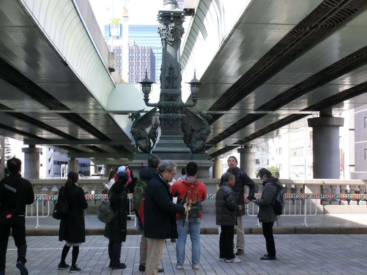 1901(明治34)年に現在の水道橋に移ったそうだ。 石碑の説明をする石橋先生。 |