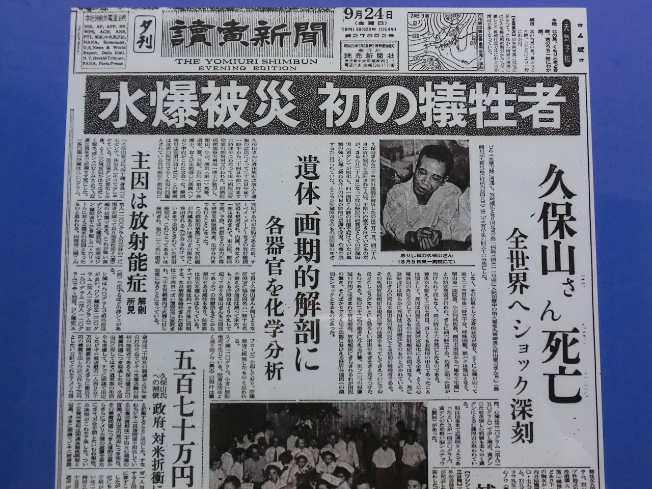 展示の中には,船員が集めた死の灰や当時の新聞などもありました。 「原子病」とか「放射能症」という言葉が新聞に見られますが,今なら 「放射線障害」という用語が使われます。 船員には,放射線宿酔や脱毛や皮膚紅斑などの症状が表れたそうです。 乗組員23名のうち,9月23日に久保山愛吉さんが放射線障害により 死亡しました。 |