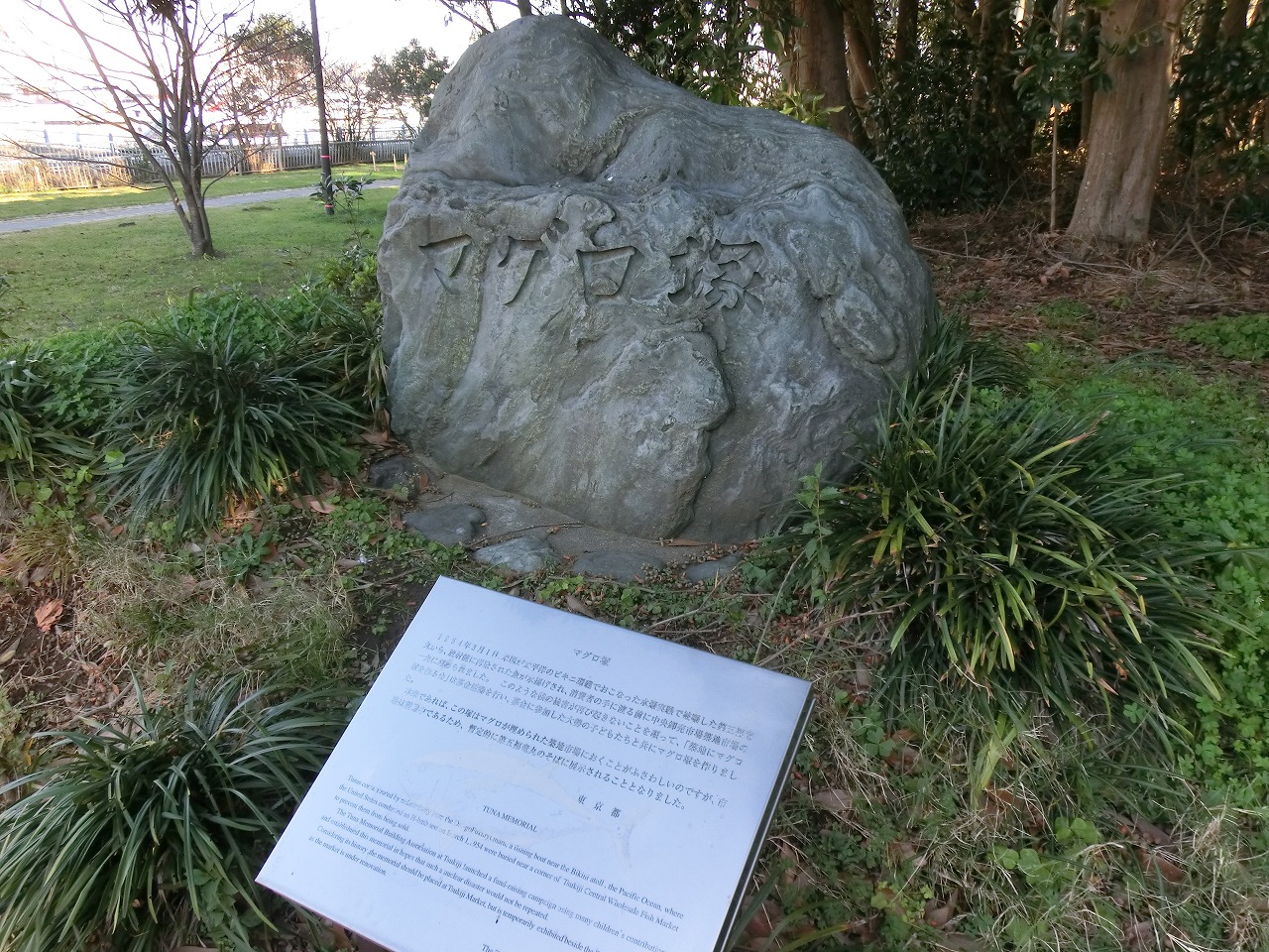 もう一つは「マグロ塚」です。 放射性物質に汚染されたマグロは海に捨てられたりもしたらしいが, 築地市場では市場内に埋設された。しかし,その位置は現在はわからない のだそうだ。 もともとこのマグロ塚を築地市場に立てたかったらしいのだが, 諸般の理由により,ここに暫定的に置いてあるらしい。 過日,築地市場に行ってみた。都営地下鉄大江戸線A1出口すぐわきの壁に 左の写真のようなプレートが貼り付けられているのみだった。 第五福竜丸については,日本アイソトープ協会の アーカイブズや,三宅泰雄『死の灰と闘う科学者』(岩波新書) によく書かれています。 |