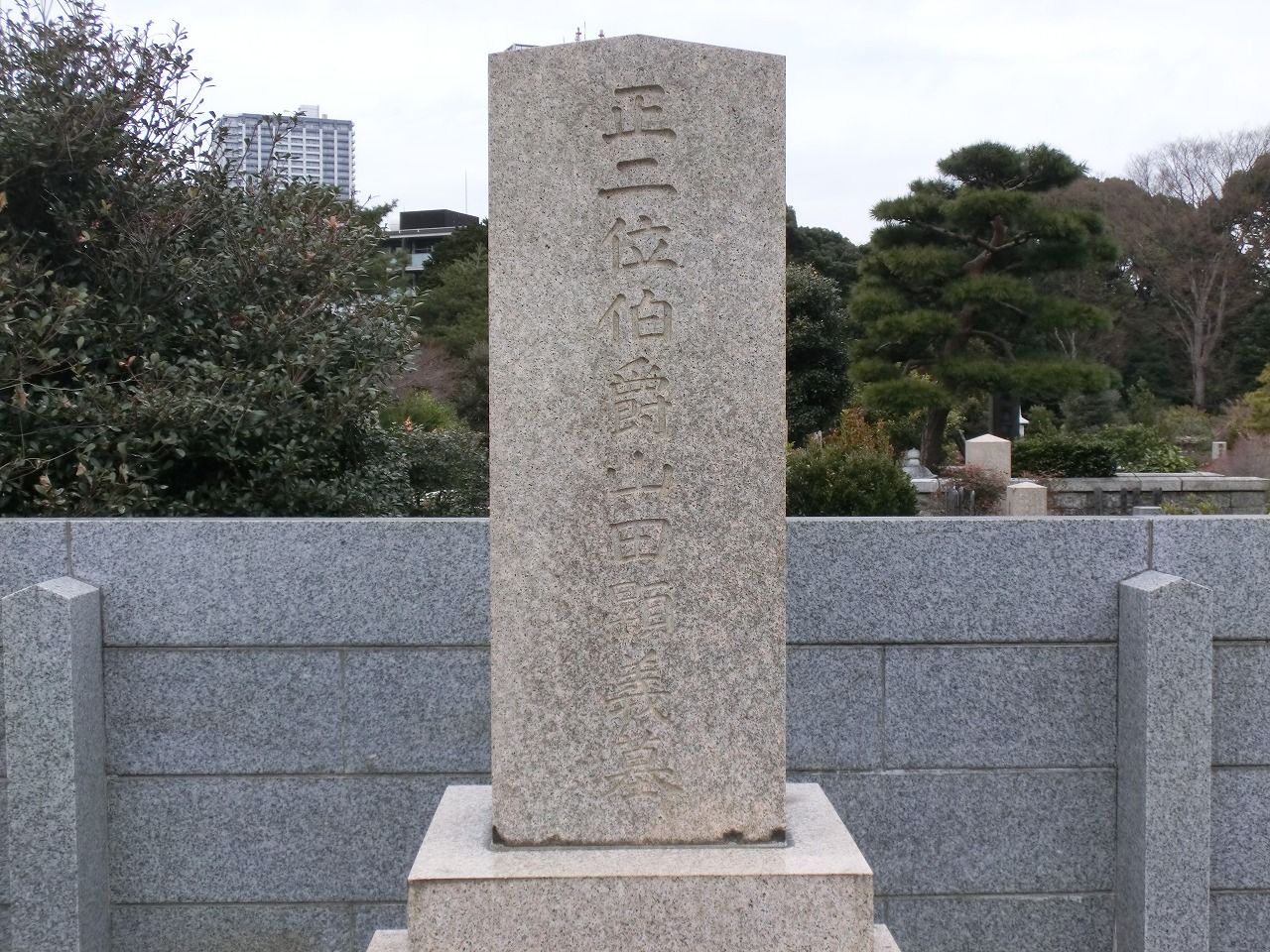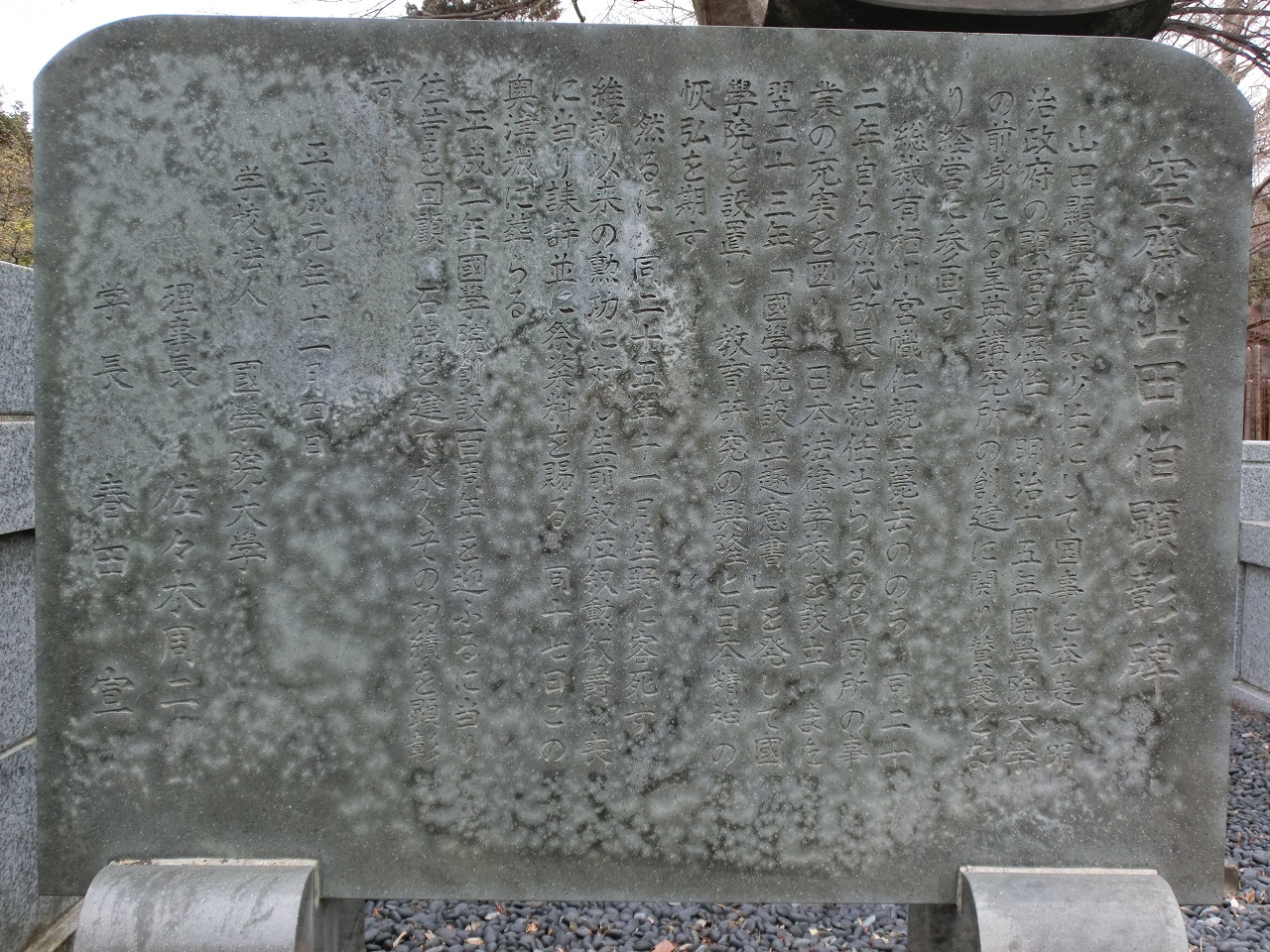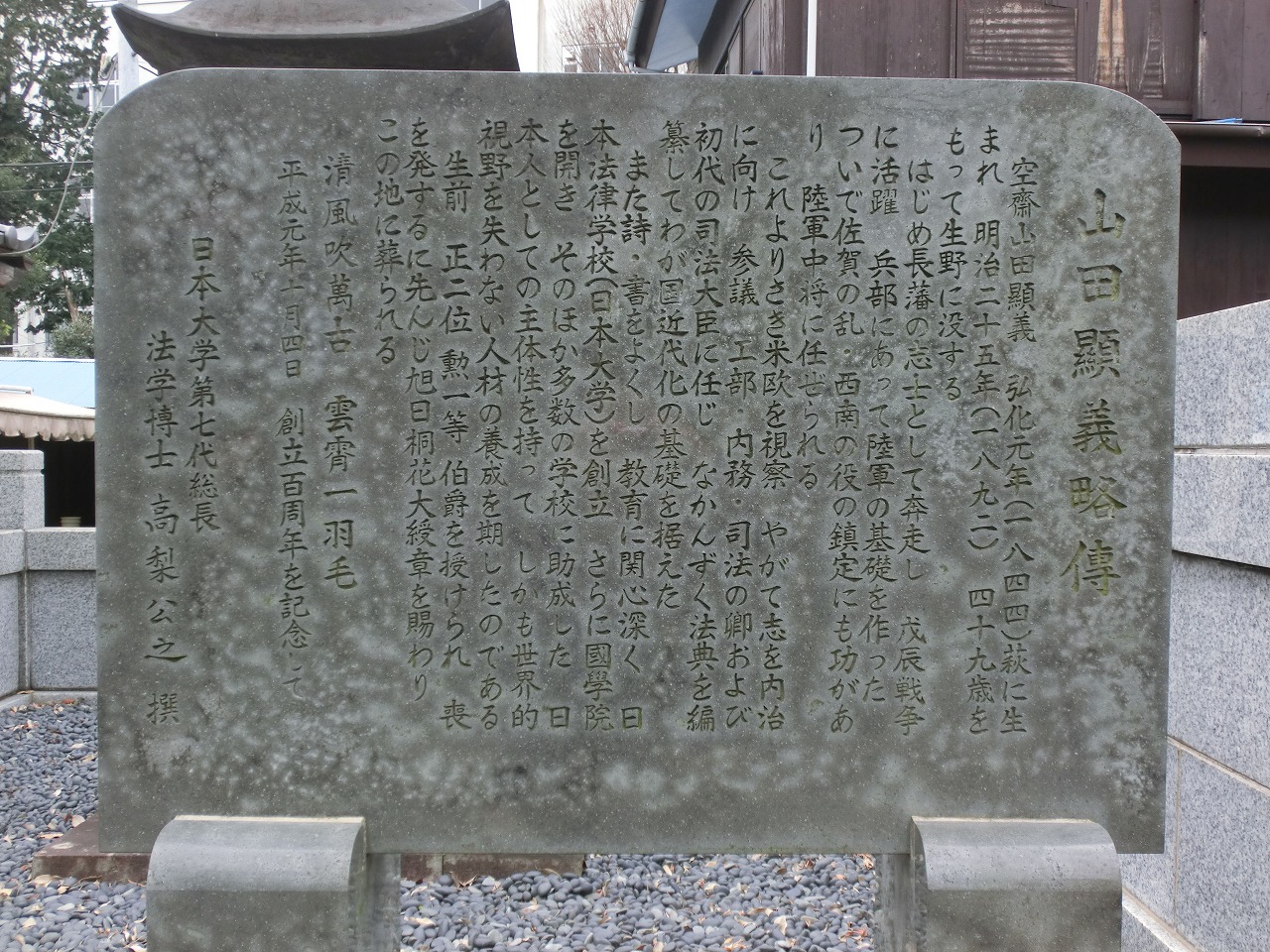 日本大学の学祖である山田顕義のお墓に来ました。 お墓入り口,左には 日本大学が建てた略伝, 右には 國學院大学が建てた 顕彰碑があります。 山田は,1882(明治15)年皇典講究所を設立し,1890(明治23)年に これが國學院大学となる。さらに, 1889(明治22)年,日本法律学校(現・日本大学)を設立した。 |