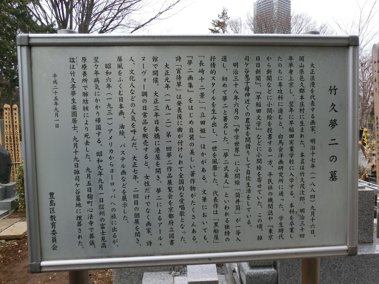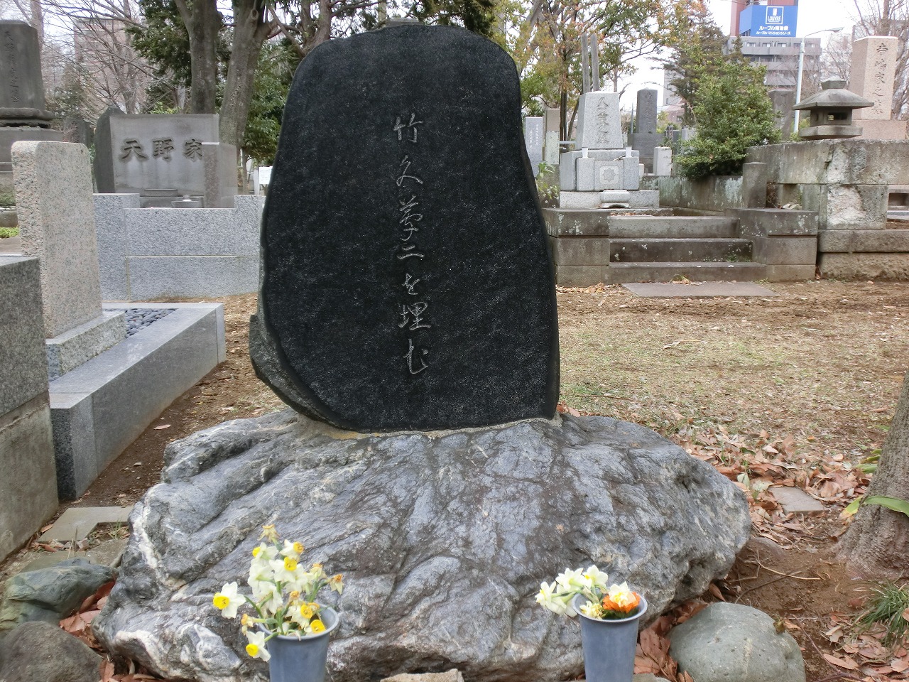 雑司ヶ谷霊園まで来ました。ここのホームページから, 霊園に眠る有名人のお墓マップがダウンロードできます。 左は,夏目漱石のお墓です。大層立派なものです。 下の2枚は,竹久夢二のものです。 |