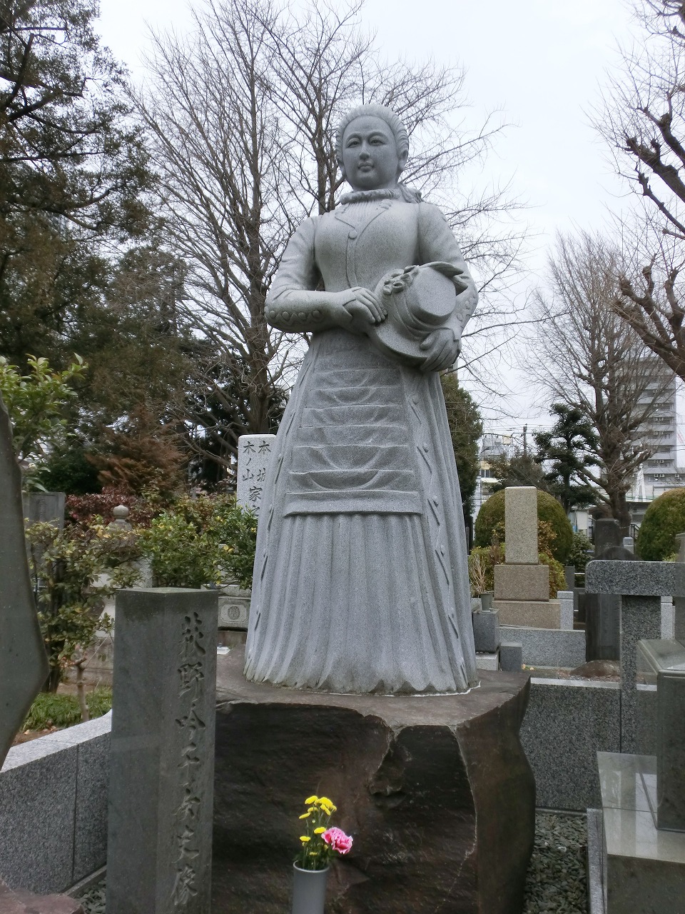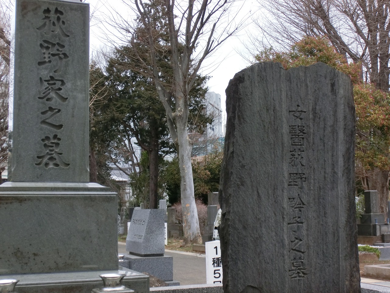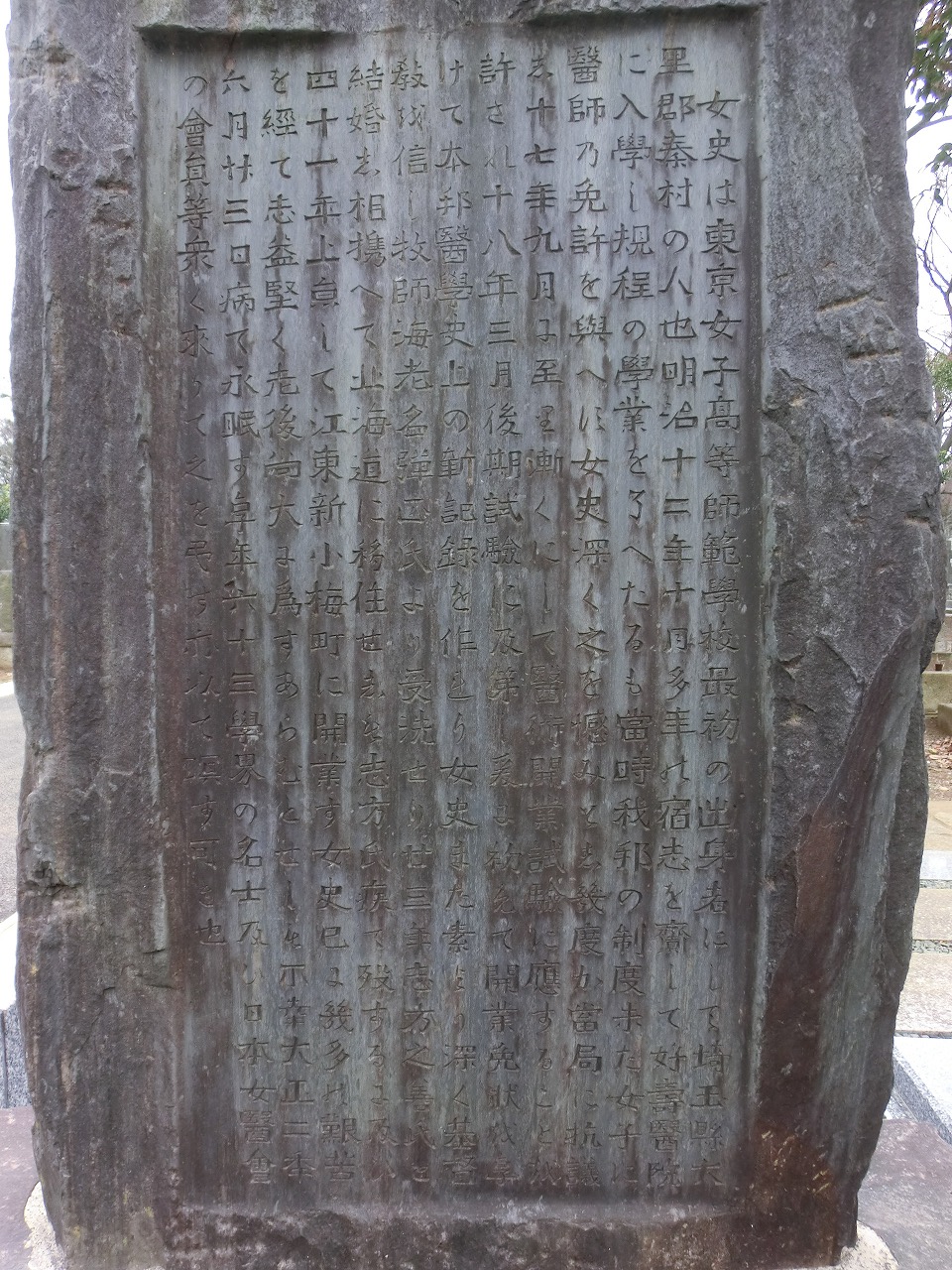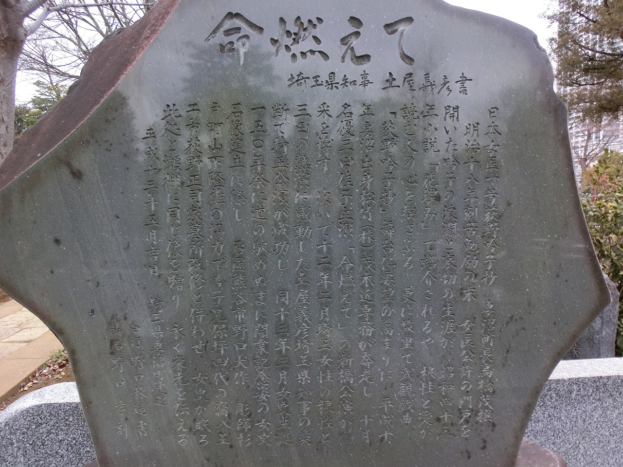 日本で最初の女医・荻野吟子のお墓に来ました。 荻野吟子は,1851年いまの熊谷市俵瀬で生まれました。 紆余曲折を経て,1885(明治18)年医術開業試験に受かり女医第1号となる。 荻野吟子に関しては,渡辺淳一『花埋み』が読めるし,熊谷市の デジタルミュージアムに詳しいです。 |