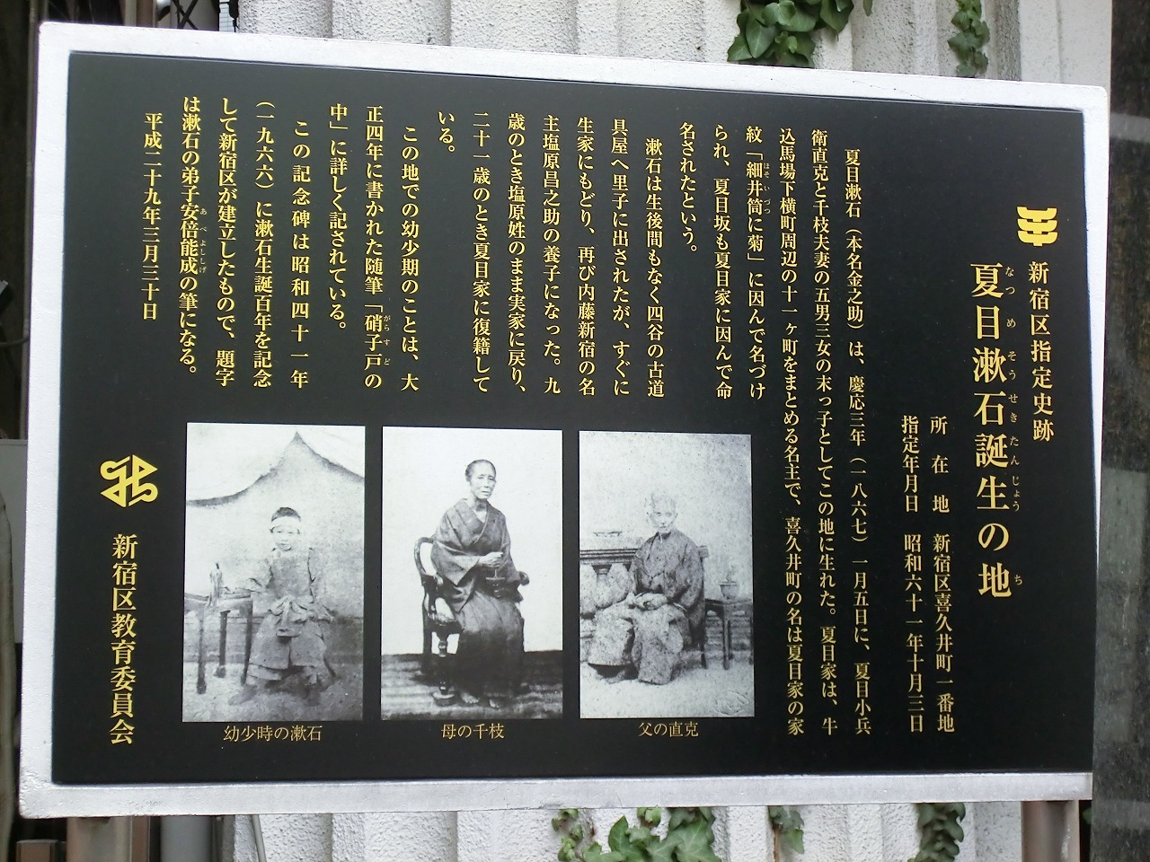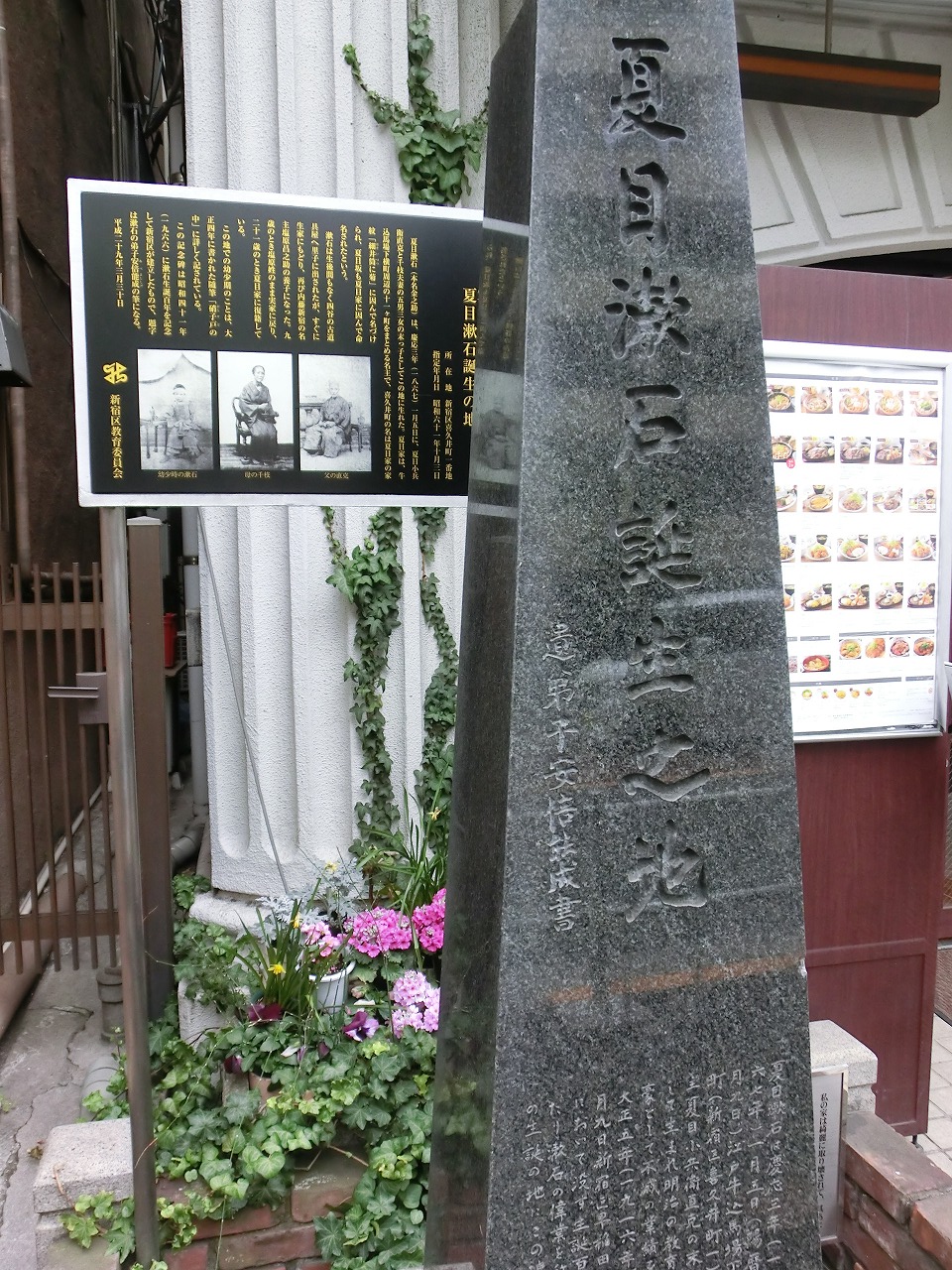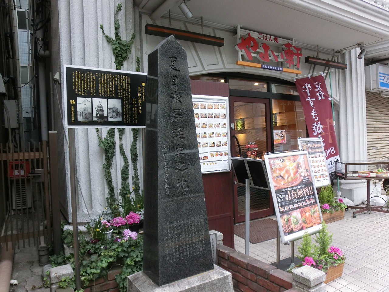 夏目坂に入ってすぐ,夏目漱石誕生の地碑があります。 地碑も立派で案内板も設置されていますが,定食屋の前で, なんとも風情がありませんでした。 |