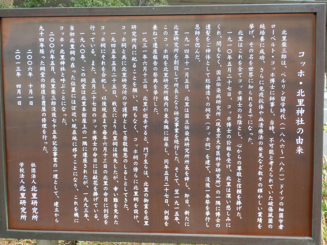 上の写真の右端に見える木は菩提樹であり,ノーベル賞をとった大村さん による寄附だそうだ。 下の2枚は,コッホ・北里神社である。北里柴三郎はベルリン時代の ロベルト・コッホのもとに留学し,数々の業績をあげた。コッホとの関係は 北里の帰国後も続き, コッホ研究所 のホームページの中に コッホの弟子たちというサイトがあり,詳しい説明入りで北里柴三郎について 書かれている. |