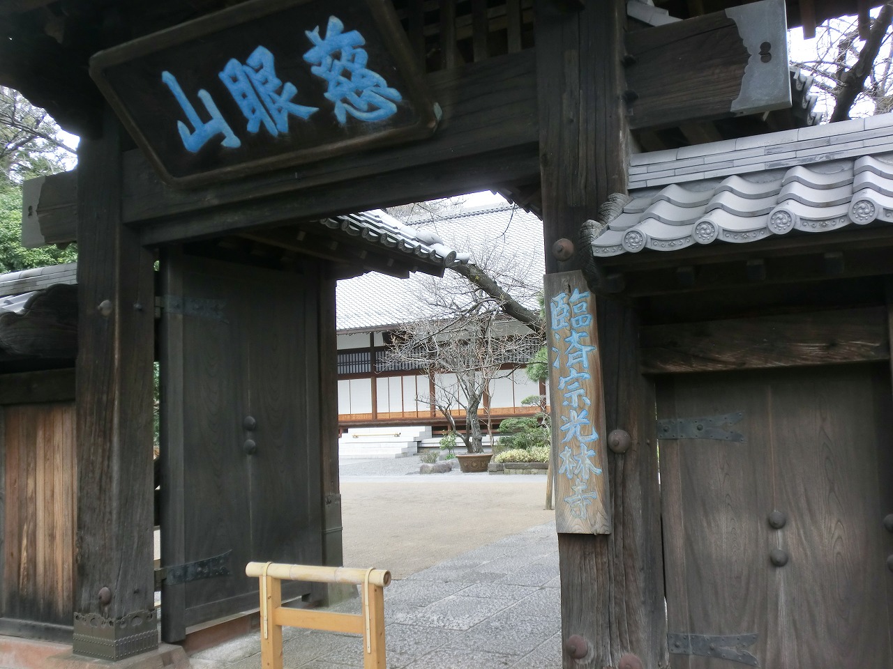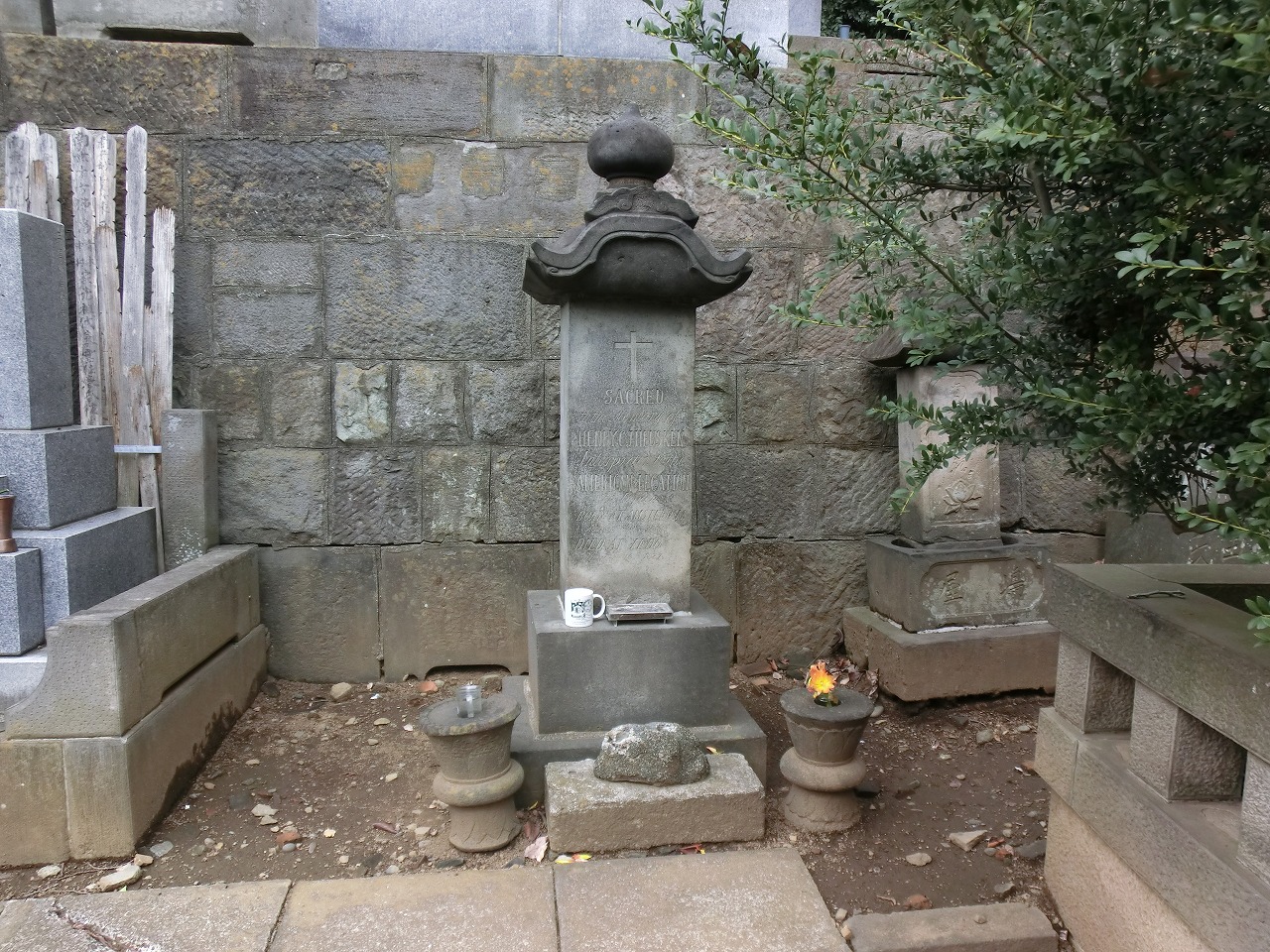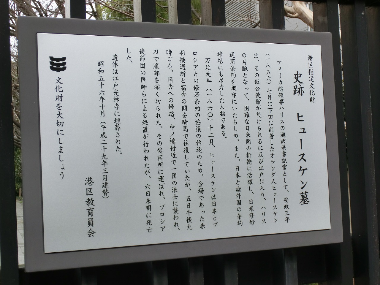 北里大学を抜けて首都高をくぐると,光林寺です。 このお寺にヒュースケンのお墓があります。和洋折衷というかどうか, 墓石には十字架と英語で文字が書かれています。 |