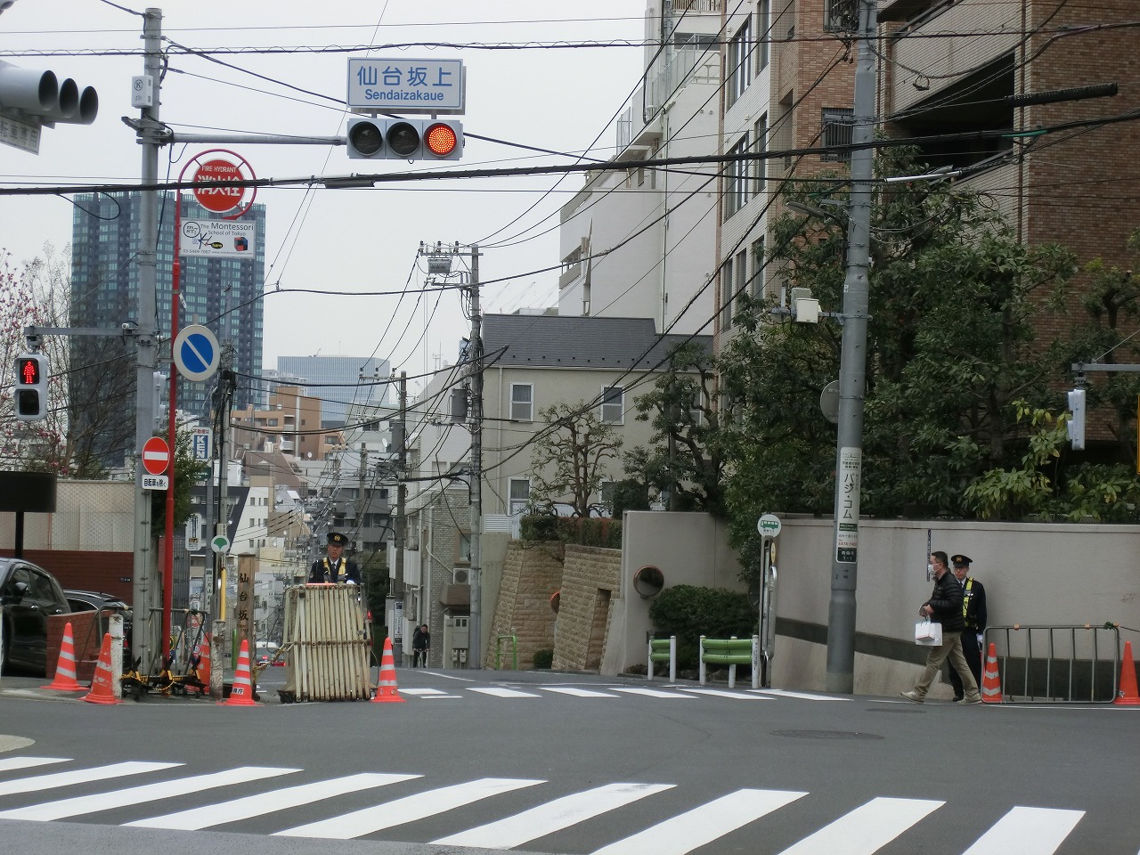 公園から右に行って仙台坂上。仙台坂を下ります。坂の途中, 右側に韓国大使館があり,ものものしい警備です。 |