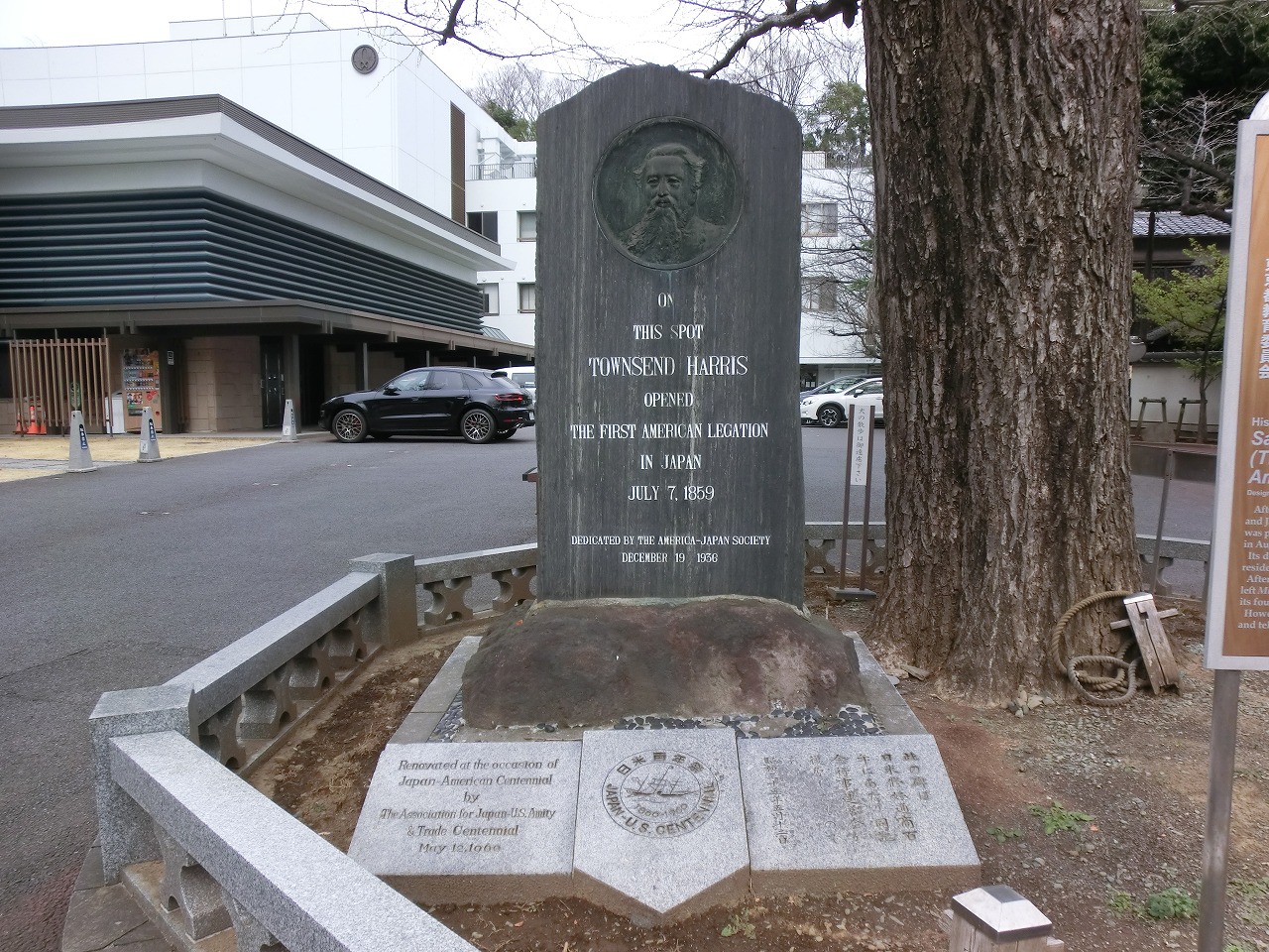 小さいお寺の間を通って,善福寺 まで来ました。 日米修好通商条約により,伊豆下田にいた総領事ハリスを公使に昇格させ, 1859年に善福寺を公使館として赴任させた。 アメリカンセンターJAPANにも詳しく書かれています。 |