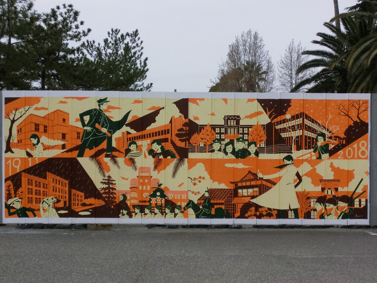 博物館という建物の前に赤レンガの古い建物がある。 九州大学本館と書いてあったが,この二つの建物を残して他はすべて 解体され,更地にする工事が行われていた。 下は九州大学の門柱と,工事のための塀に描かれた絵。 |