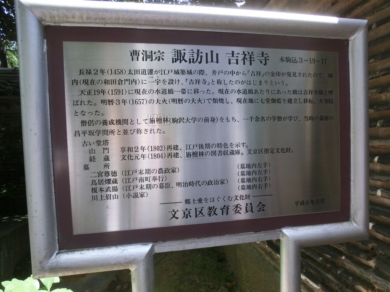 諏訪山吉祥寺 室町時代の1458年に太田道灌の開基で江戸城内に創建。道灌は,江戸城築城に際し 和田倉付近の井戸から「吉祥」と刻銘した金印を得,これを祥瑞として西の丸に 建立。山号はこの地が諏訪神社の社地であったため。 のち徳川家康の関東入府にともない駿河台(現在の都立工芸高校周辺)に, さらに明暦の大火と江戸大火によって現在地に移転。 武蔵野市の吉祥寺の由来は,明暦の大火によって,諏訪山吉祥寺の門前町が焼失 した際,江戸幕府は都市計画に基づき同地を大名屋敷として再建することに したため,吉祥寺門前の住人をはじめとする居住地・農地を大幅に失った者達 に対し,現在の武蔵野市東部を開墾して住人たちを移住させたことによる。 八百屋お七・吉三郎の比翼塚,二宮尊徳の墓,その他著名人・大名家の 墓多数。 |
