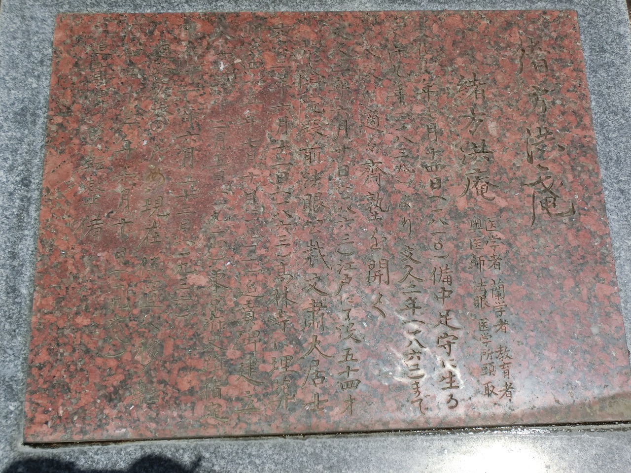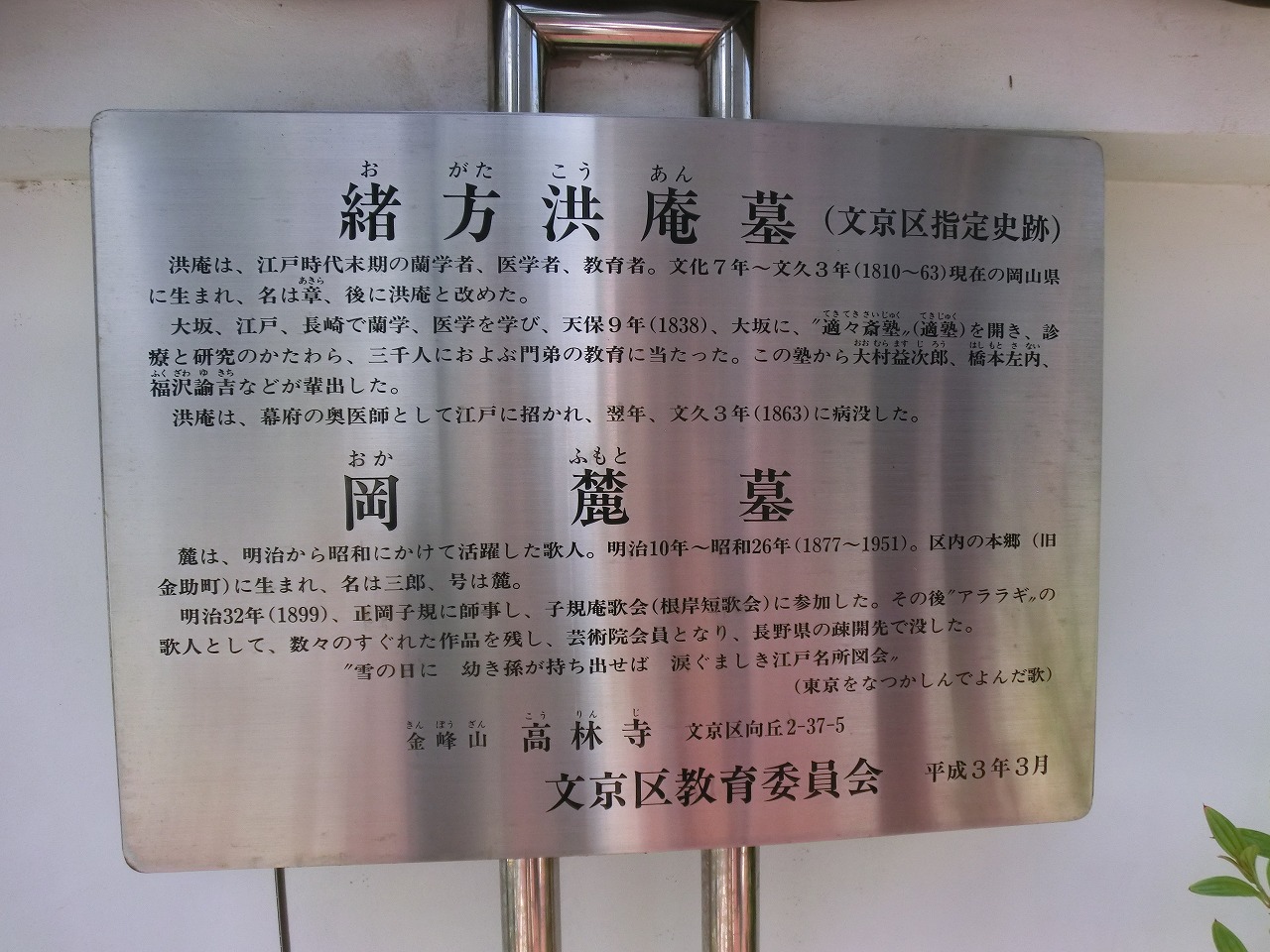 高林寺 慶長元年に神田に創建され,同9年にお茶の水に,また明暦の大火後に 現在地に移転。 神田にあった際に一夜境内に突然清泉が噴出,将軍にお茶用の水として提供 したことによりお茶の水という地名がおこったという。 墓地内に,幕末期の蘭学者・緒方洪庵の墓や明治・大正期の歌人・岡麓の墓がある。 緒方洪庵:江戸時代後期の医学者,蘭学者。1810年7月14日生まれ。大阪に出て 中天游に,1830年江戸で坪井信道に入門。長崎に遊学の後,大阪に 適々斎塾(適塾) をひらく。門人は3000人ともいわれ,大村益次郎,福沢諭吉らがいる。 これが大阪大学医学部の発祥といわれている。 1862年幕府に招かれ,奥医師と西洋医学所頭取をかねた。この医学所が東京大学 医学部の発祥としている。 1863年6月10日死去。54歳。 |