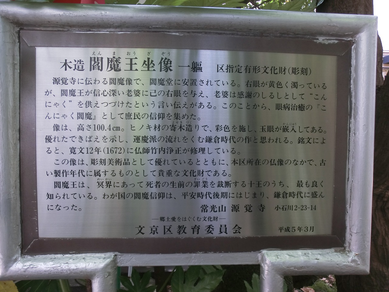 1624年創建。徳川秀忠・家光から信仰を得ていた。 こんにゃく閻魔:閻魔像の右側の眼が黄色く濁っているのが特徴。 宝暦年間(1751~1764年)に一人の老婆が眼病を患いこの閻魔大王像に日々 祈願していたところ,満願の夜,老婆の夢に閻魔大王が現れ,「我,日月にも 等しい両眼のうち一つをえぐり取って汝に授べし」と告げたという。 その後,老婆の眼はたちまちに治り,以来この老婆は感謝のしるしとして 自身の好物である「こんにゃく」を断って,ずっと閻魔大王に供え続けたという。 以来この閻魔王像は「こんにゃくえんま」「身代わり閻魔」の名で人々から 信仰を集めている。 |